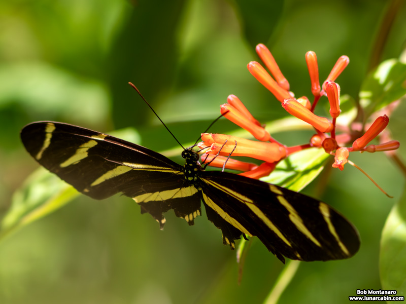 Zebra Longwing butterfly foraging among the flowers of a Firebush in the Audubon House landscaping.