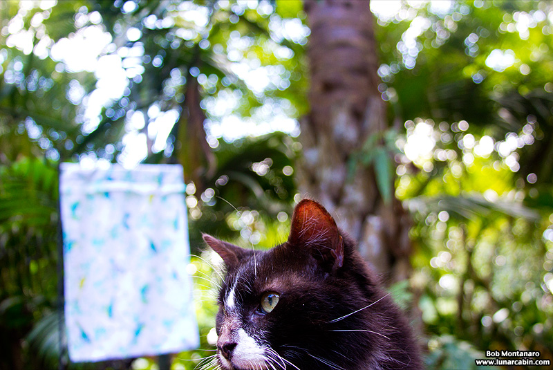Palm trees and cats at one home, with seemingly home-made picturesque cloth garden flags dotting the landscape.