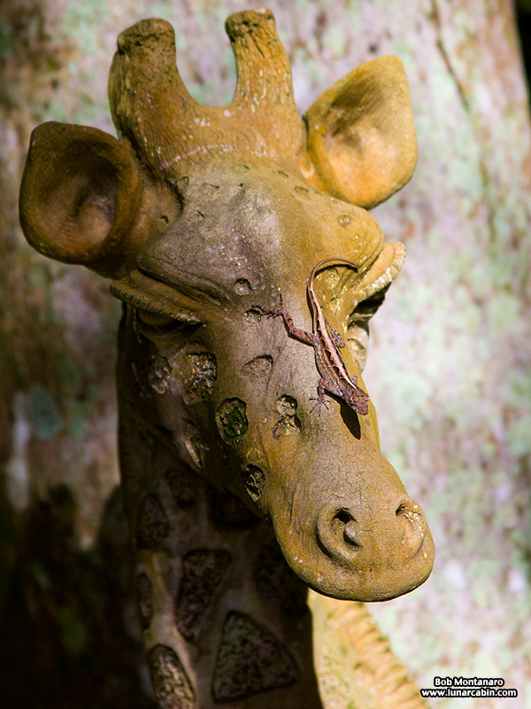 Cuban Anole perched atop a giraffe’s nose.
