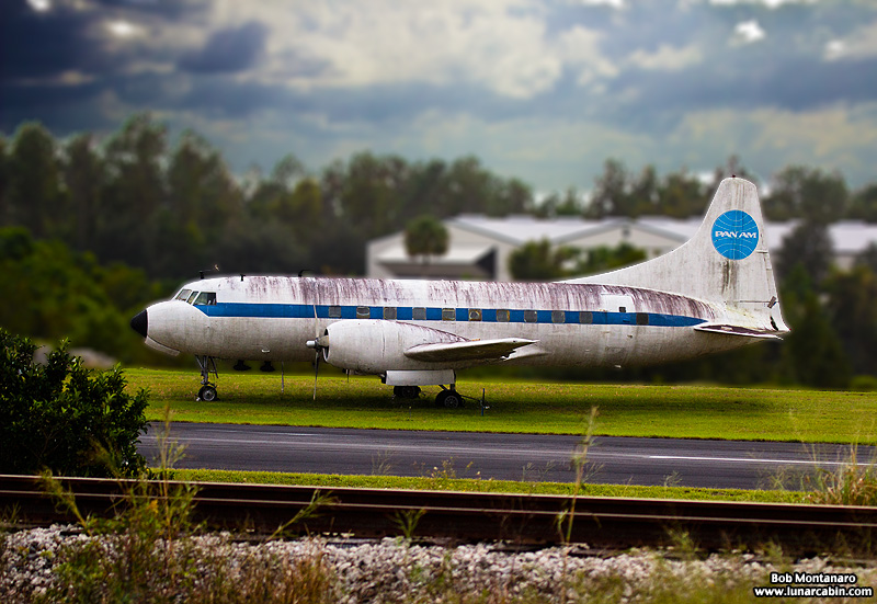 An elderly Convair 240 built in the late 1940s sits at Orlando-Apopka Airport easily visible from Highway 441 from where these images were taken from a passing car. Accommodating 40 or so passengers in a pressurized compartment, the Convair 240 helped usher in the modern airline industry. Then there is a friend of mine who flew across the Atlantic from New York to London in a similar plane many years ago. Think of it now as quite a feat when considering the size of ocean-hopping jetliners today compared with this propeller-driven little antique. And finally a faint recollection from a 1983 movie filmed at the Vero Beach Airport of the revolution in Nicaragua – a bizarre location choice for anyone who has ever been to Vero Beach, which is in sore need of a little shaking up – and a bunch of old airplanes though this one did not have anything to do with it. Just jarred the memory a bit. Crowd of locals playing refugees storming the airport in the middle of the night. Self-conscious smiles on their faces as they ran toward the cameras. The grim specter of revolutionary death never realized, which is most likely why today the movie, Last Plane Out starring a luckless Jan Michael-Vincent, hides beyond the line in almost complete obscurity. That, and bad acting, of course.