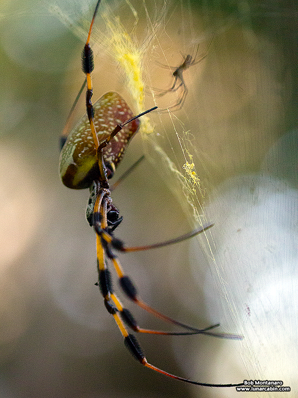 An old friend; a female Golden Silk Spider (Nephila clavipes) with her diminutive mate visible above her in the blurry distance. (At the Oslo Riverfront Conservation Area)![]()