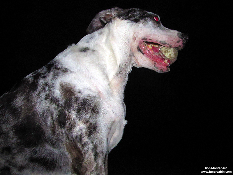 Pepper (Canis lupus familiaris) in complete joy that she could chase her ball all over the beach in the bright moonlight while the cruise ships passed by offshore.