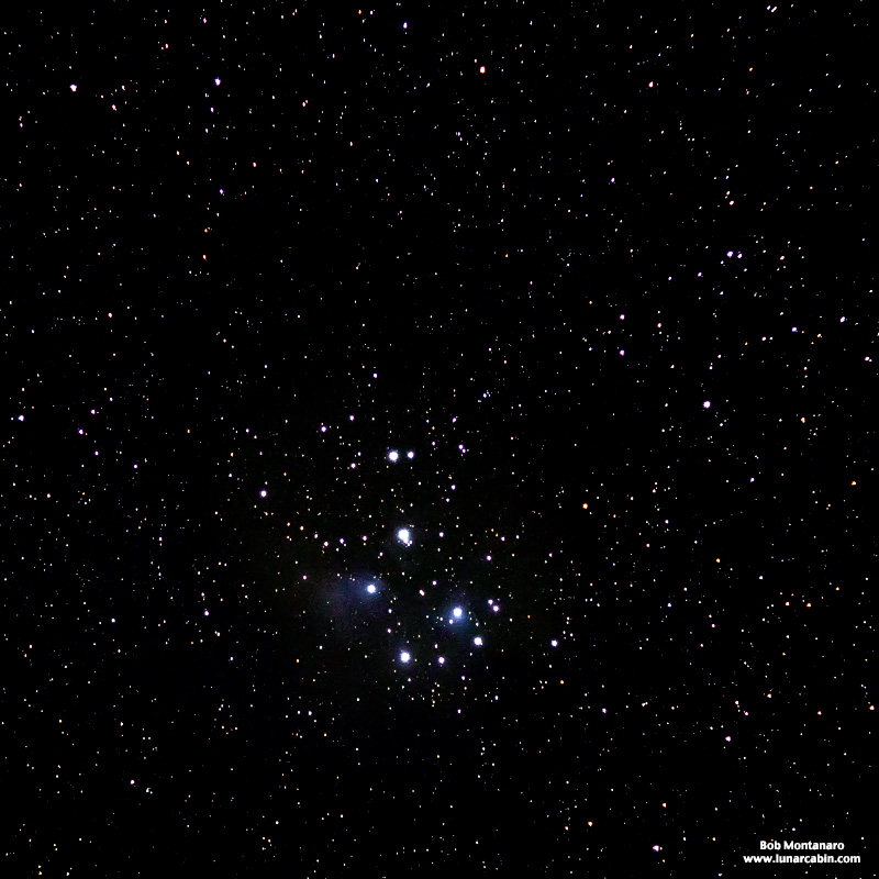 The Pleiades, also called the Seven Sisters, as seen from the backyard. The exposure was just beginning to show the nebulosity still shrouding the open star cluster but was cut short when the clouds rolled in.