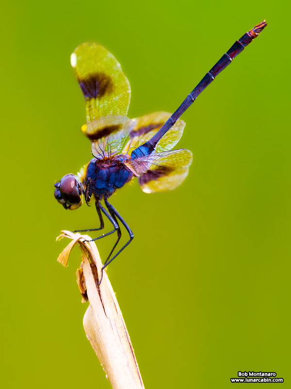 This dragonfly has taken an obelisk posture with the end of the tail pointed toward the Sun. This posture reduces the surface area exposed to sunlight and helps to cool the insect on hot days.