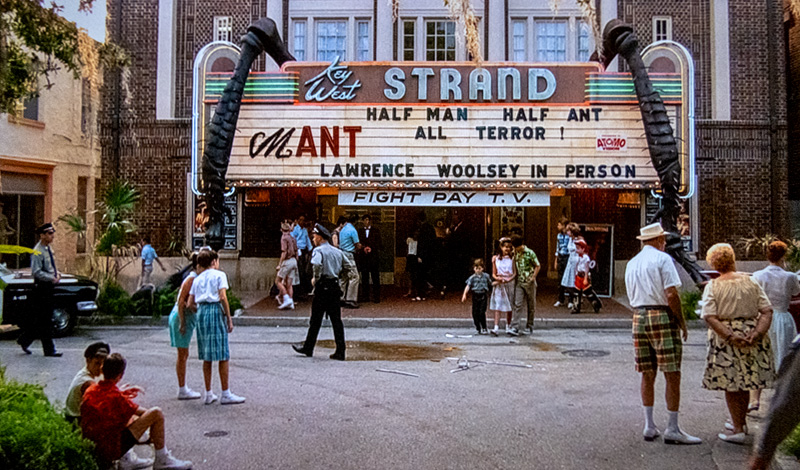 Matinee is an homage to the classic science fiction films of the 1950s and 1960s. For the film, a fake facade was added to the exterior of the Playhouse to accommodate a more movie theater look with a colorful, well-lit marquee. Only exterior shots involving the movie theater were filmed here with the interior shots being filmed on a purpose-built set at Universal Studios in Orlando.
