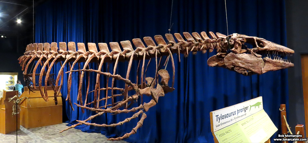 This shallow sea was filled with prehistoric life like the marine reptile Tylosaurus proriger, an apex predator whose fossilized stomach contents from numerous fossil remains found throughout the Midwest revealed it preyed upon a wide variety of contemporary fauna—including members of its own species!