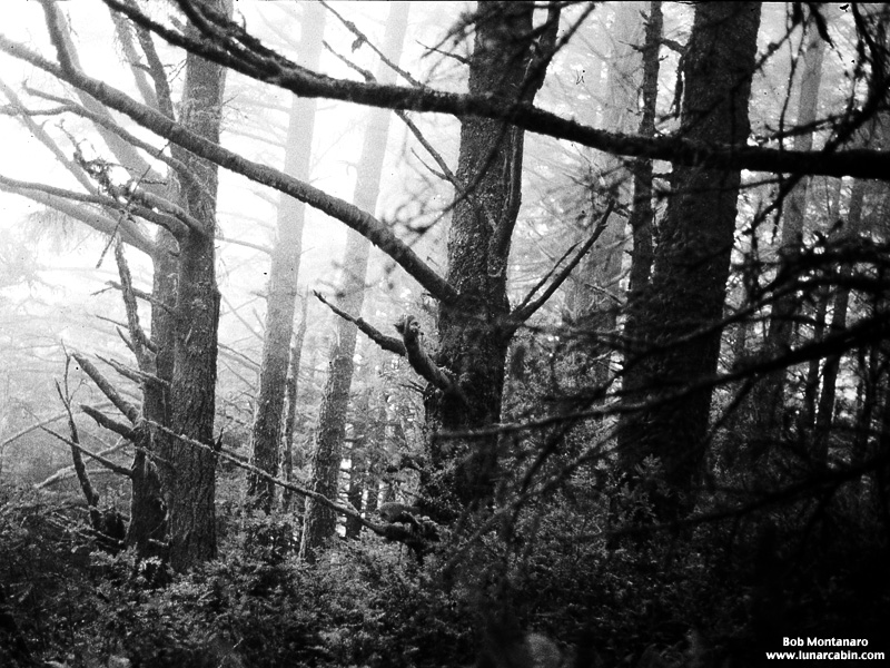 A cold fog permeates woodlands along the mountainous Northern California coastline during an unremembered hike. From the slide archive.