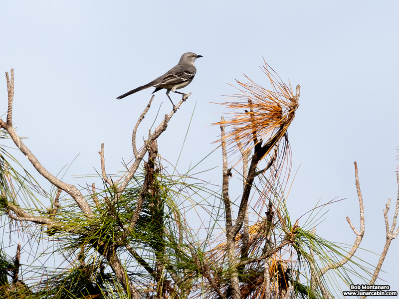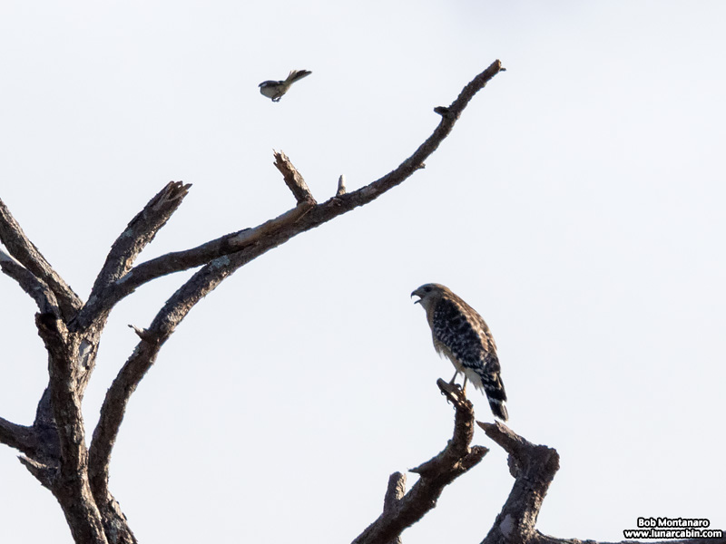 A Northern Mockingbird trying to harass a Red-shouldered Hawk out of its territory.
