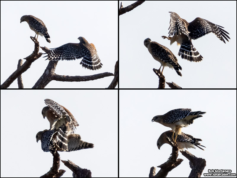 A second Red-shouldered Hawk appeared causing the Mockingbird to wisely retreat. The two hawks mated – it is close to nesting season, after all.