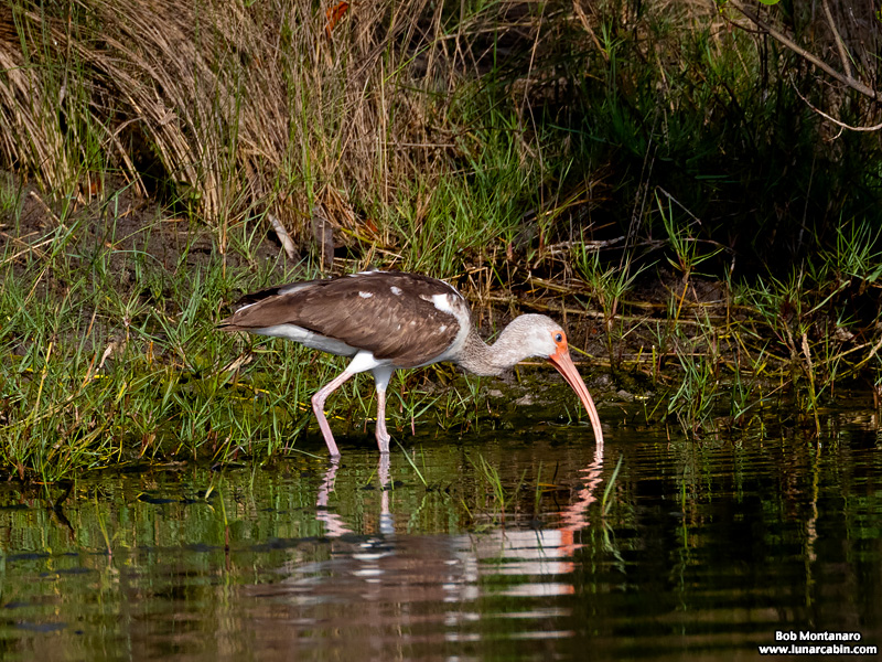 A juvenile White Ibis forages along the pond’s shoreline. The juvenile’s brown feathers will molt to white as it matures.