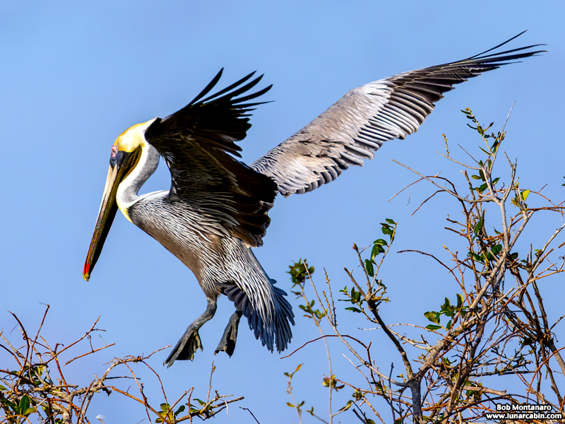A Brown Pelican returns to try again to collect sticks for its nest.