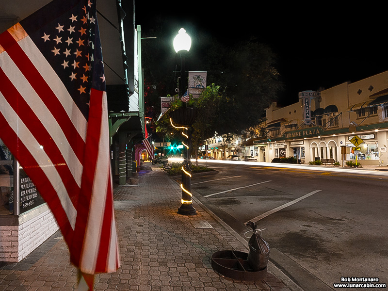 Late night downtown Vero Beach on the eve of Memorial Day 2021. A couple of businesses already had flags out. Too bad the neon Theatre Plaza sign had turned off for the night.