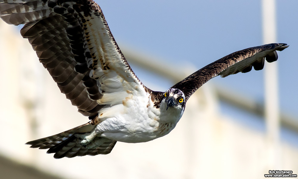 The Sebastian Inlet State Park bridge can be seen behind an Osprey flying over the inlet channel.